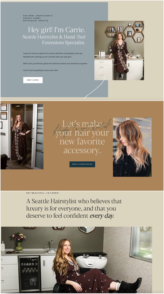 Carrie is a Seattle-based hair stylist who specializes in high-quality hair extensions and helping her clients achieve their perfect blonde. Her Showit website project differs from the first two I’ve shared here because hers was designed from a template!